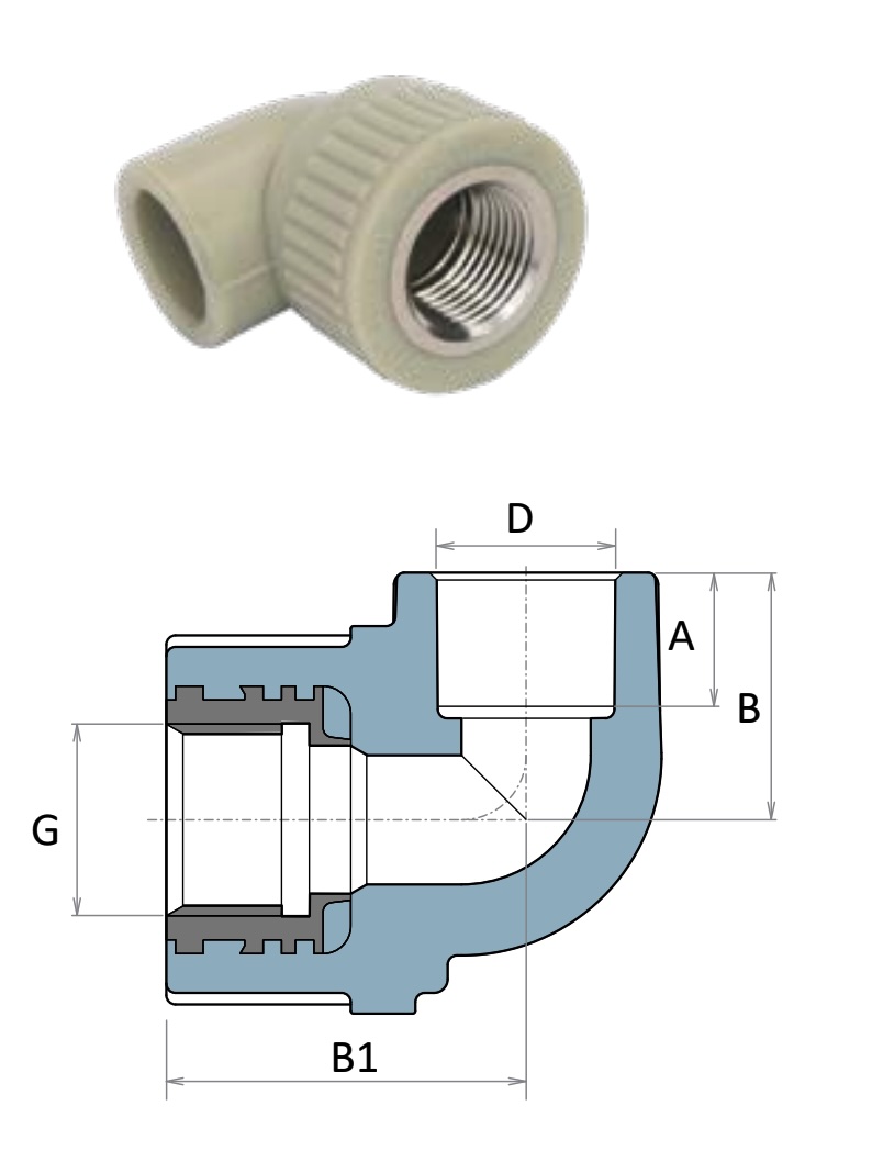 Кутник 90° з металевою внутрішньою різьбою використовується для з'єднання труб під прямим кутом у водопровідних та опалювальних системах. Він виготовлений із поліпропілену (PPR) із вбудованою металевою гільзою для забезпечення надійного різьбового з'єднання.