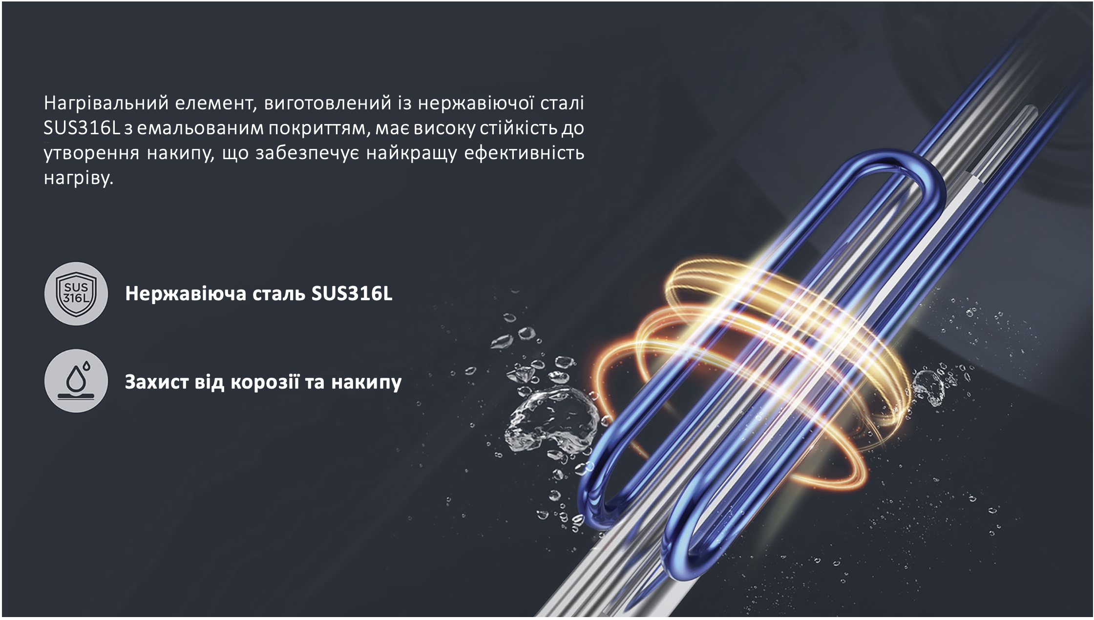 • Ефективний нагрів: Прилад оснащений нагрівальним елементом («мокрий» ТЕН) потужністю 1500 Вт, що забезпечує оптимальний баланс між швидкістю нагріву та навантаженням на електромережу.