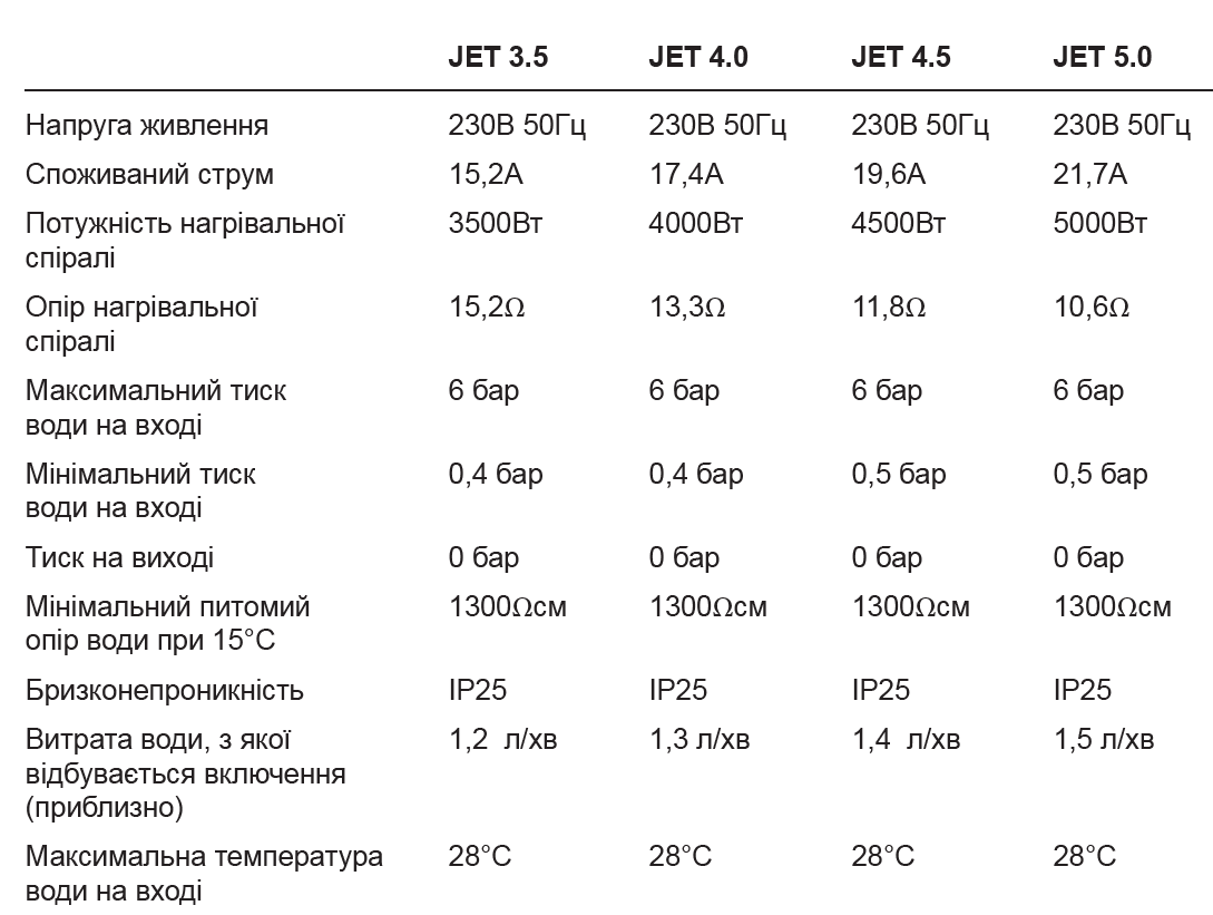 Модельний ряд лінійки JET включає водонагрівачі потужністю 3.5, 4.0, 4.5, 5.0 кВт.