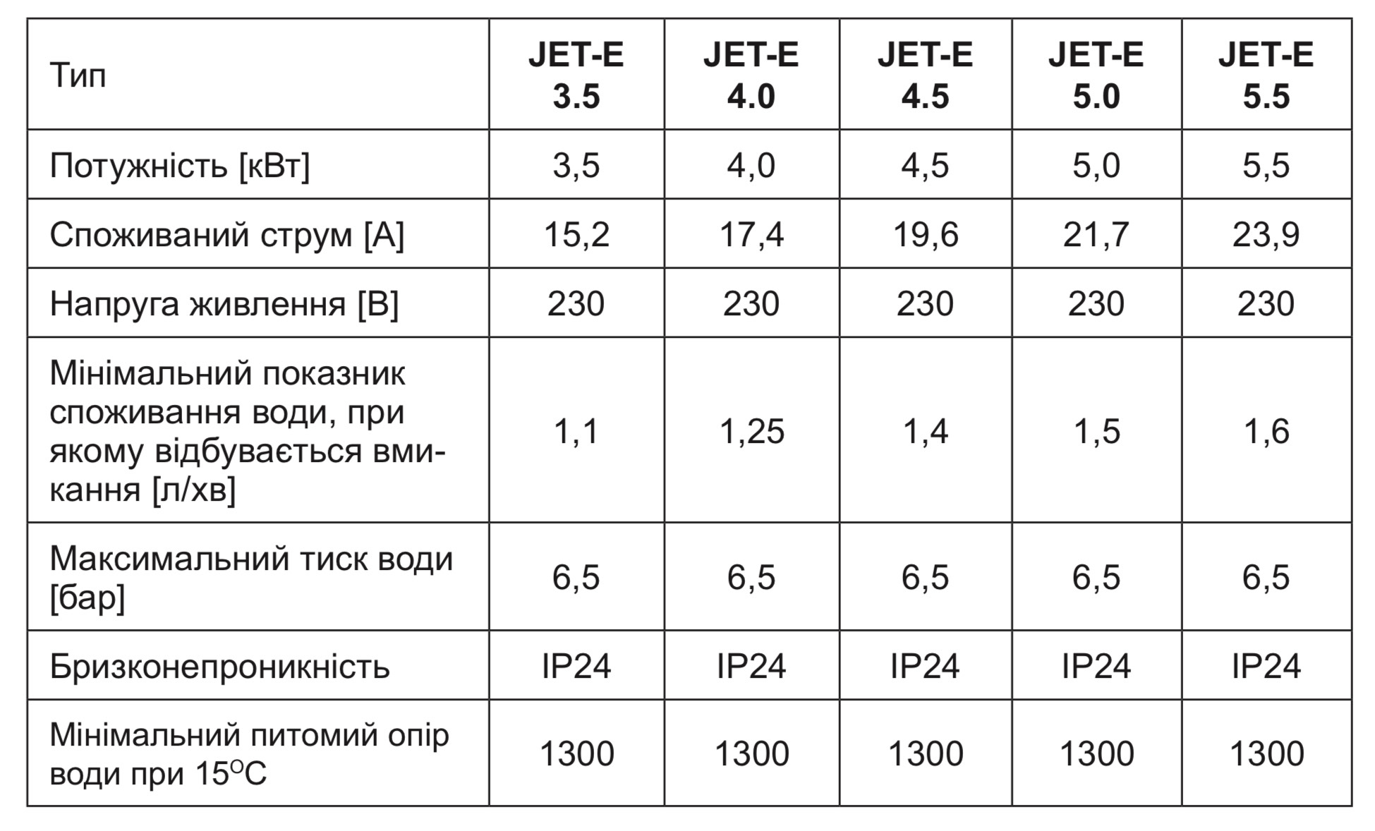 Модельний ряд лінійки JET-E включає однофазнІ водонагрівачі потужністю 3.5, 4.0, 4.5, 5.0, 5.5 кВт, а також трифазні-7.0, 8.0, 9.0 кВт.