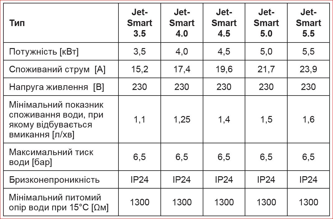 Модельний ряд лінійки JET-SMART 3.5 включає водонагрівачі потужністю 3.5, 4.0, 4.5, 5.0, 5.5 кВт.